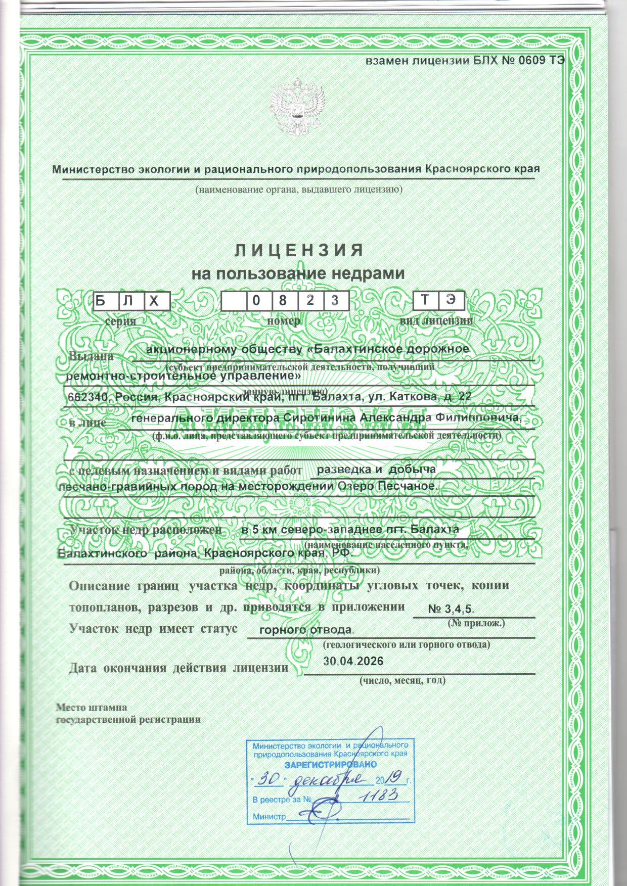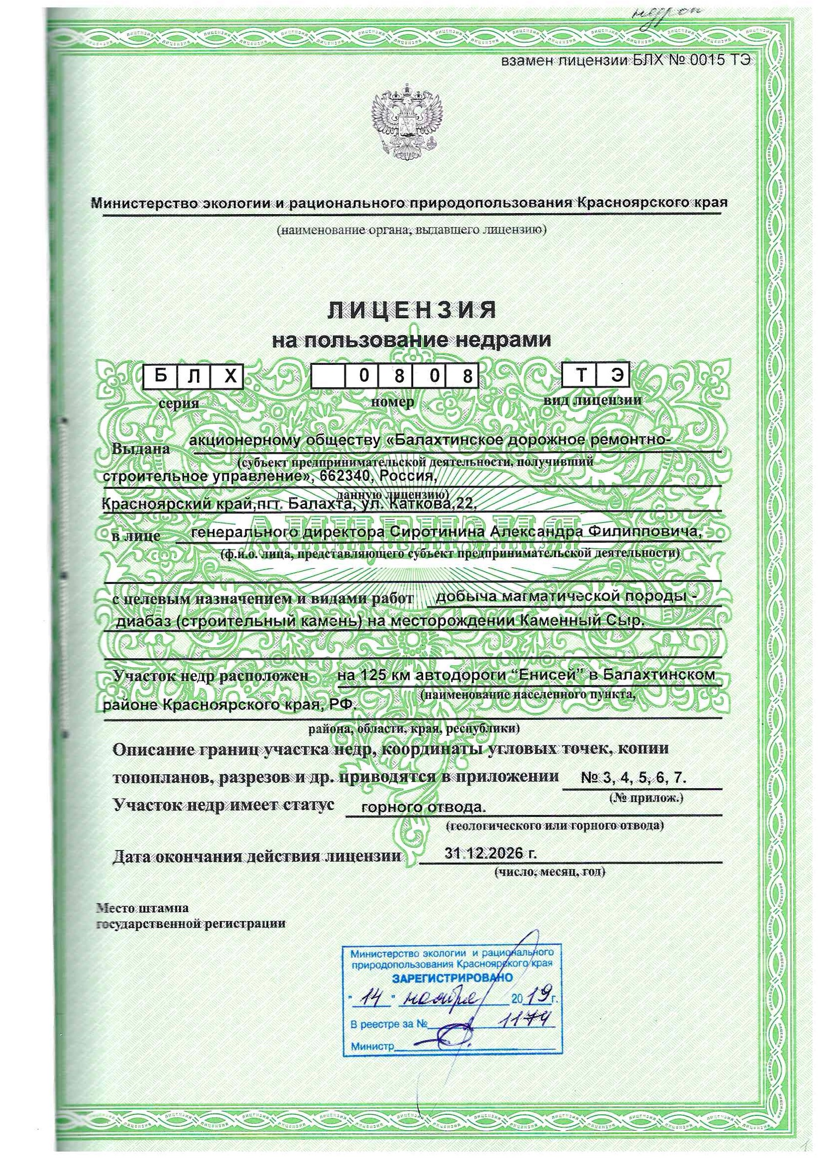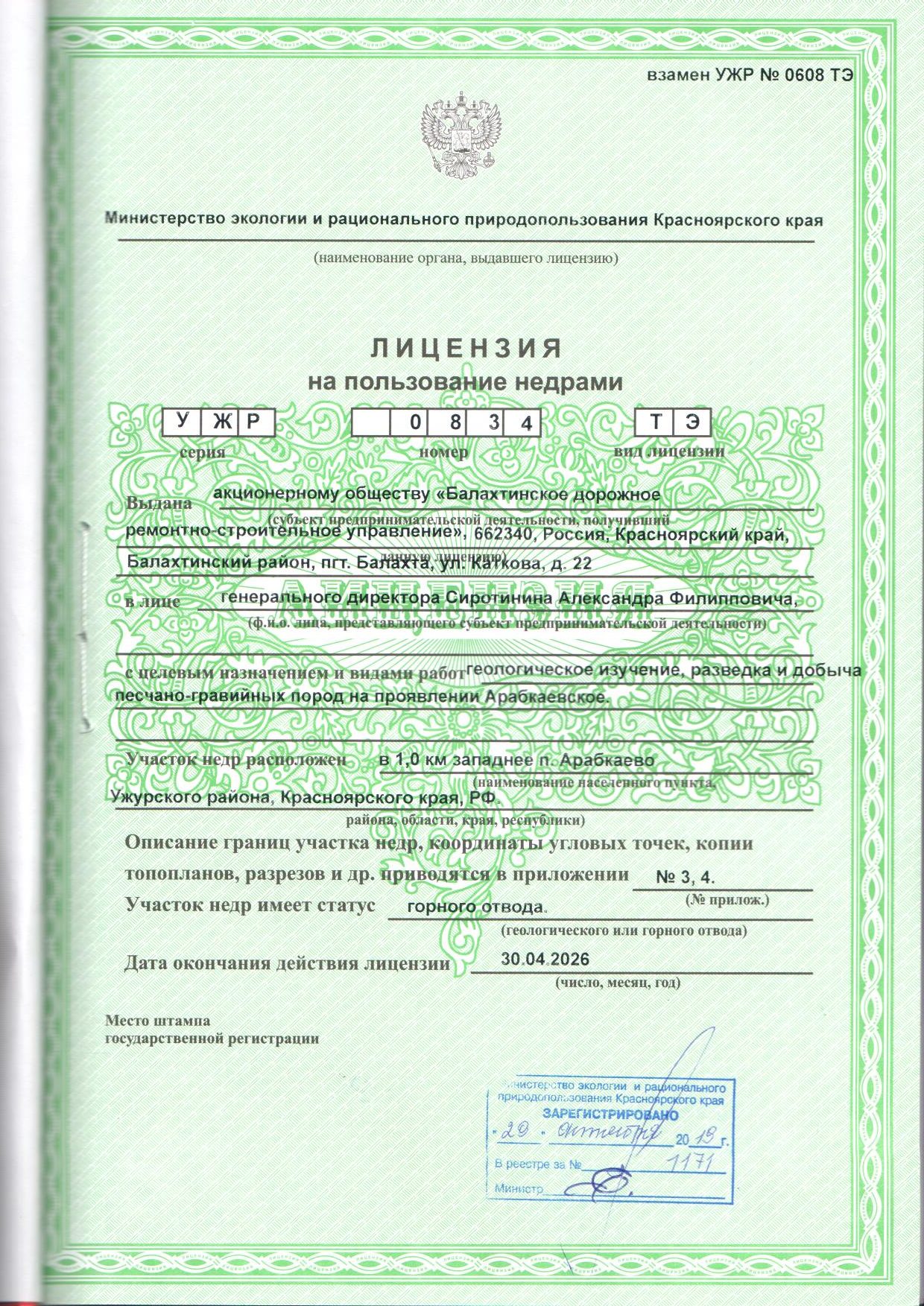 АО “Балахтинское ДРСУ” имеет лицензии на 9 месторождений в 4 районах Красноярского края — Балахтинском, Новоселовском, Ужурском и Шарыповском. Из них активно действующих на данный момент 6 карьеров — 3 месторождения строительного камня (песчаника), 3 месторождения ПГС.