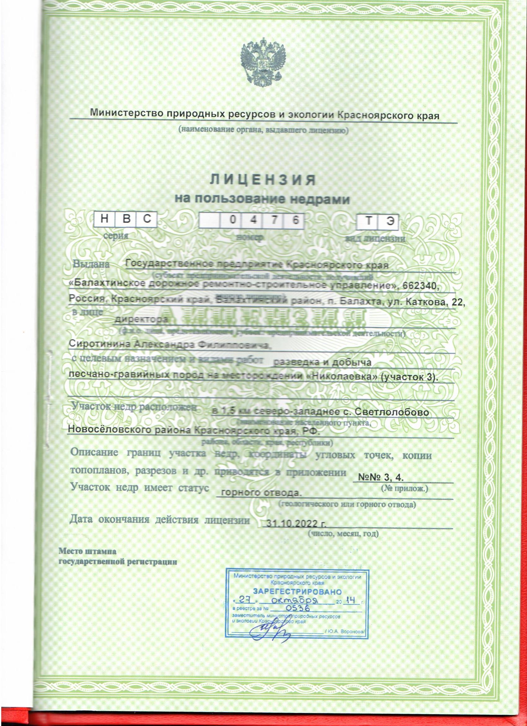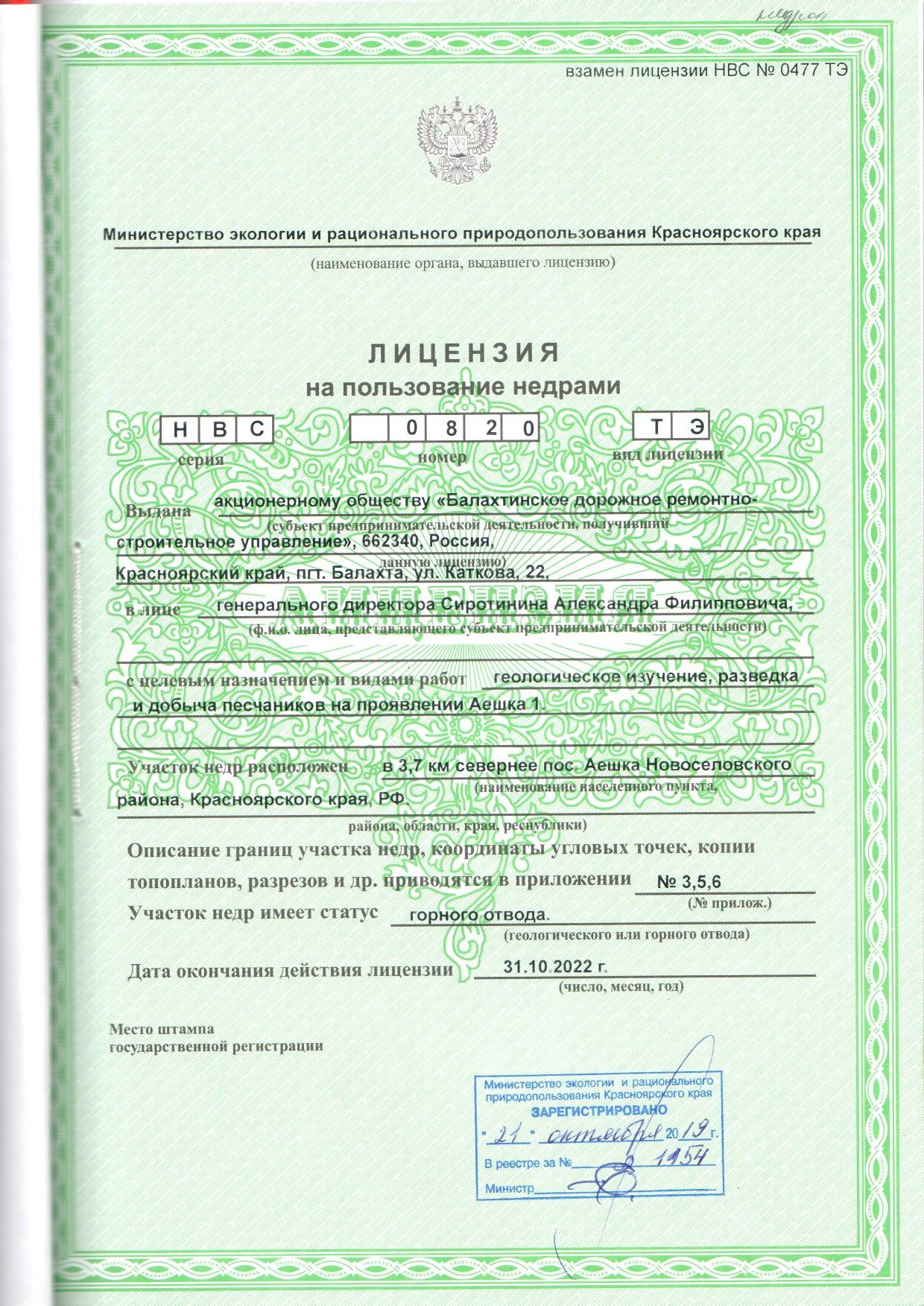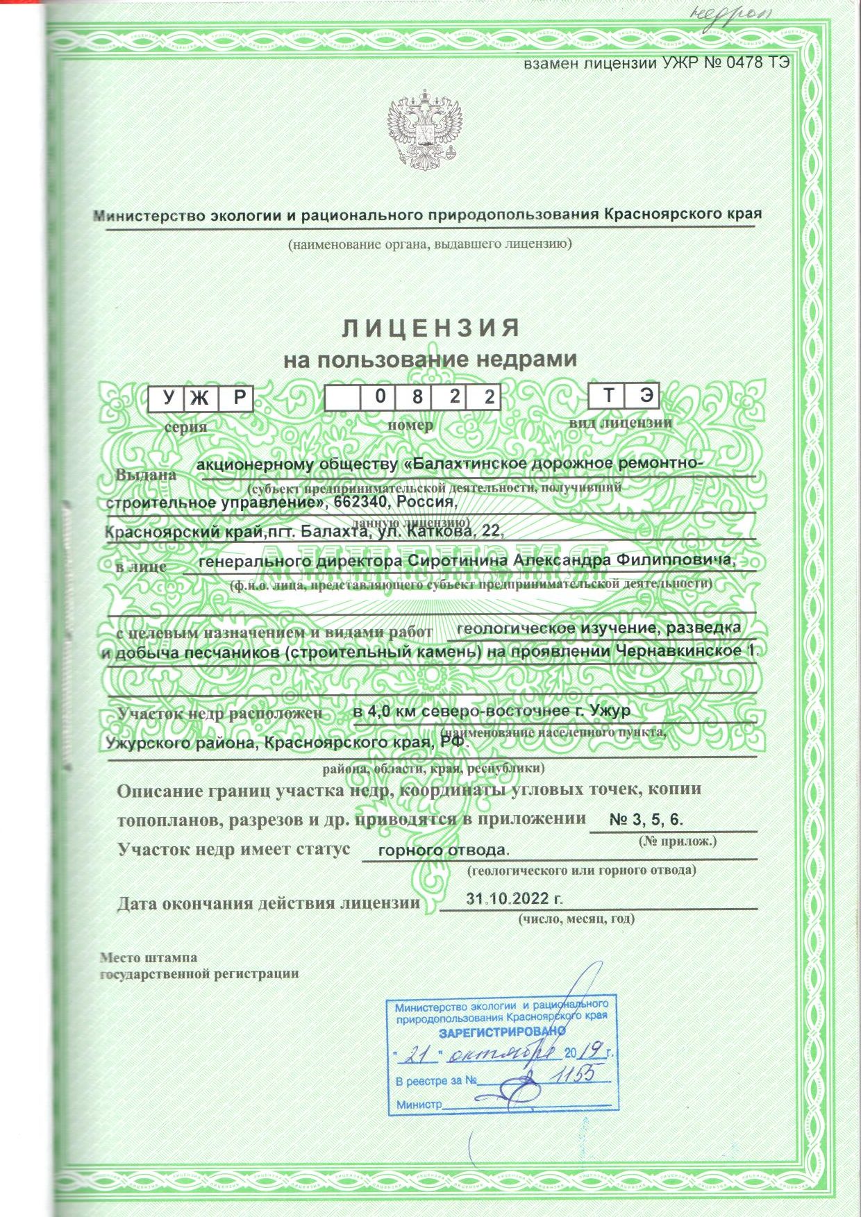 АО “Балахтинское ДРСУ” имеет лицензии на 9 месторождений в 4 районах Красноярского края — Балахтинском, Новоселовском, Ужурском и Шарыповском. Из них активно действующих на данный момент 6 карьеров — 3 месторождения строительного камня (песчаника), 3 месторождения ПГС.